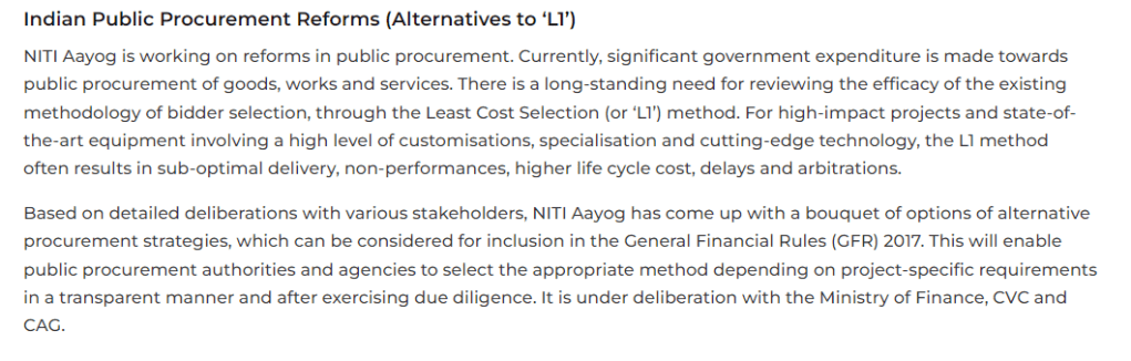 L-1 The Niti Ayog has the following to say about the L1 bidding (https://niti.gov.in/verticals/project-appraisal-and-management-division) (Accessed 27th September 2023)