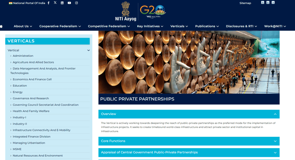 The Niti Ayog, India’s highesy policy making body, also maintains a page on PPPs. https://www.niti.gov.in/verticals/ppp