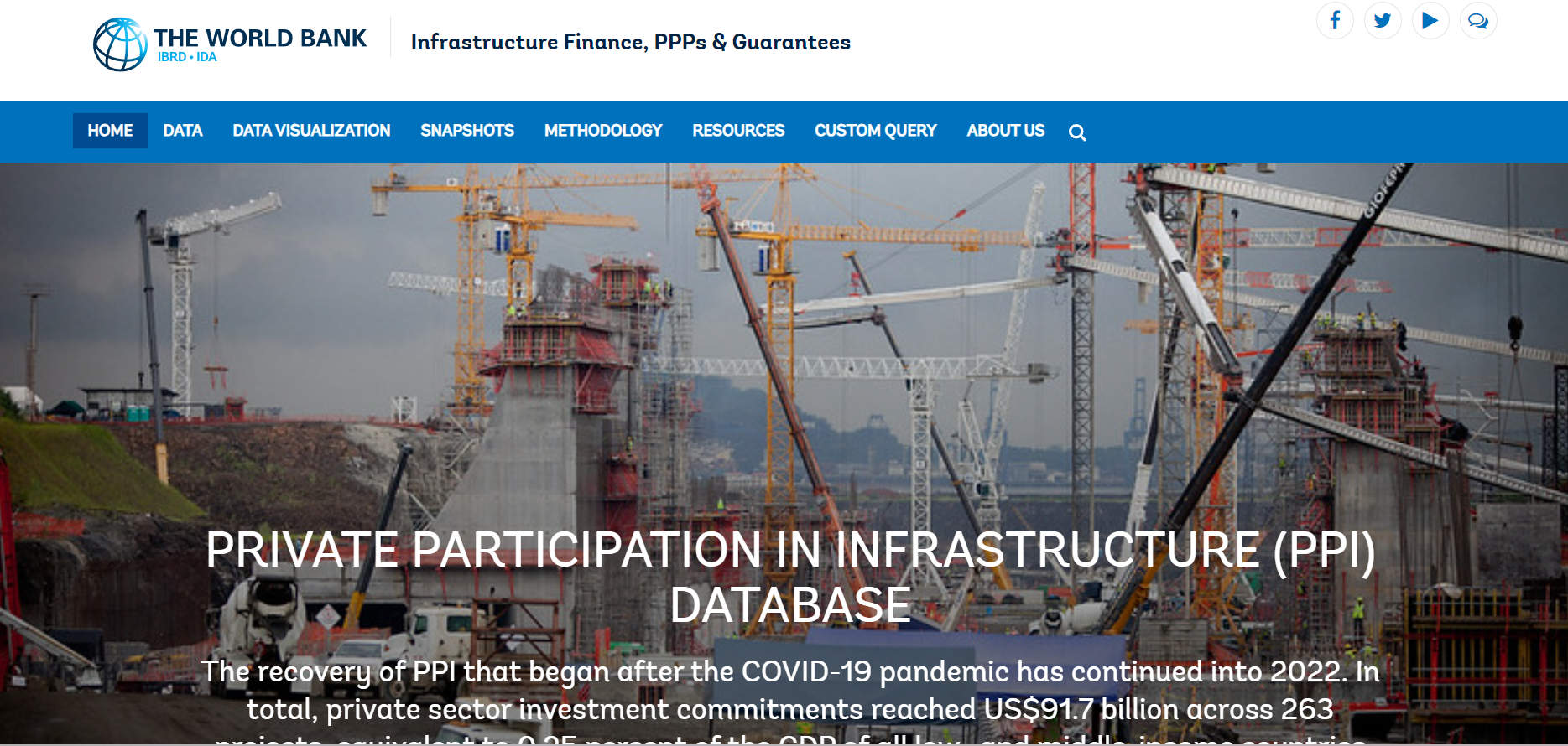 The World Bank, Infrastructure Finance Group, similarly maintains a resoucres bases for PPPs , which is of extreme high value. https://ppi.worldbank.org/en/ppi and https://ppp.worldbank.org/public-private-partnership/